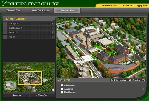 The Fitchburg State interactive campus map is a powerful tool for creating and maintaining audience-specific campus maps and providing immediate access to any location on campus. As an added convenience to visitors, the map is fully searchable, and custom layers allow Fitchburg State to highlight particular campus locations.