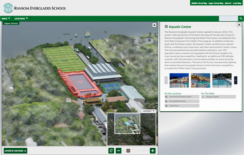 CLICK HERE TO LAUNCH THE RANSOM EVERGLADES SCHOOL INTERACTIVE MAP EXPERIENCE View more virtual tours and campus maps created by CampusTours The Ransom Everglades School interactive map features three new photo-realistic campus maps drawn by CampusTours cartographers that depict trees, shrubs, people, statues and locations with stunning clarity. CampusTours artists rendered the middle school, upper school and island campuses using three-dimensional software and then painstakingly applied accurate textures and colorations to produce these ground breaking campus maps. The new maps will be used in print as well as online. According to CampusTours visitor surveys, photorealistic maps like the Ransom Everglades School maps are considered the best campus maps available today. CampusTours new AnyMap 3.0 ushers in a new age in interactive maps, built completely in HTML5, supporting full browser display, mobile devices, improved data handling, dynamic window resizing, Global Positioning System (GPS) integration, active state URLs for bookmarking, and much more. With AnyMap 3.0, institutions can have a brand new interactive map launched in under thirty days. CampusTours AnyMap supports custom layers of any kind. Custom layers allow organizations to place icons on the map or highlight items on the map. CampusTours has redesigned AnyMap 3.0 from the ground up, and one of the biggest changes is the move from windows to panels for building information. In earlier versions of AnyMap, building windows would sometimes open over the location the visitor had clicked on the map obscuring it from view. AnyMap 3.0 exchanges windows for side-mounted panels that slide out next to the location that has been clicked, maintaining context for the visitor. AnyMap 3.0 includes a special Smartphone Module, designed specifically to work on smartphones without the need for an app download. Several studies have indicated that prospective students are visiting college .edu Web sites with their mobile devices, and they are frustrated when elements of the sites do not work on their phones, tablets and other Internet-enabled devices. In this environment, it is vital for schools to have a capable HTML5/JavaScript solution that presents a compelling and GPS-enabled alternative interactive map for visitors. The AnyMap Mobile Device Module supports mobile devices like smartphones and mini-tablets, while full sized tablets now receive the full HTML5 AnyMap experience (including GPS). AnyMap GPS integration allows your visitors to monitor their travel through campus on their phones or tablets. With screen sizes proliferating, CampusTours has built an adaptable interface onto AnyMap that works well on both smaller and larger screen resolutions. This allows visitors with larger monitors and better graphics cards to see a much larger view of campus, while visitors on smaller monitors and less capable graphics cards still receive an optimized presentation. A cornerstone of all CampusTours products is the ability for institutions to make content changes quickly and easily, without recurring charges. Ransom Everglades School may add or update this presentation at any time with the CampusTours MultiMedia Engine software. As visitors move through the map, clicking on items, AnyMap 3.0 actively updates the URL, giving visitors the ability to press the forward and back button in the browser, and to use the Favorites or Bookmarks feature. ![]() |